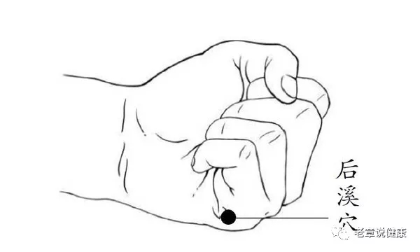 一般取手上后溪穴和脚上的束骨穴。后溪穴怎么找呢?先把手握成拳,在第 5 掌指关节后的远侧掌横纹头赤白肉际处即是,也就是握拳后,掌指关节后横纹的尽头就是后溪穴。临床上,后溪穴是用来调理头项强痛、腰背痛、手指及肘臂痛等痛证的好穴。