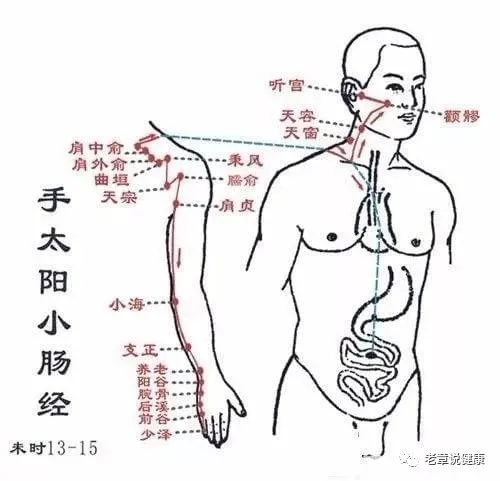 手太阳小肠经上有19个穴位,均为双穴,左右各一,共38个。起于小指尺侧指甲旁0.1寸的少泽穴,经过手掌和腕部尺侧,从前臂外侧的后缘上行,在肩胛骨部位绕行,止于耳屏前、下颌骨髁状突后方张口凹陷处的听宫穴。经过我们颈椎部分的就是手太阳小肠经。也就是说,当颈椎出现问题时,其实是小肠经的经络不通,颈椎疼痛的真正病根儿,在小肠经,小肠经容易堵塞的位置分别是后溪穴、天宗穴、肩贞穴,而这些也是调理颈椎疼痛的常用穴位。